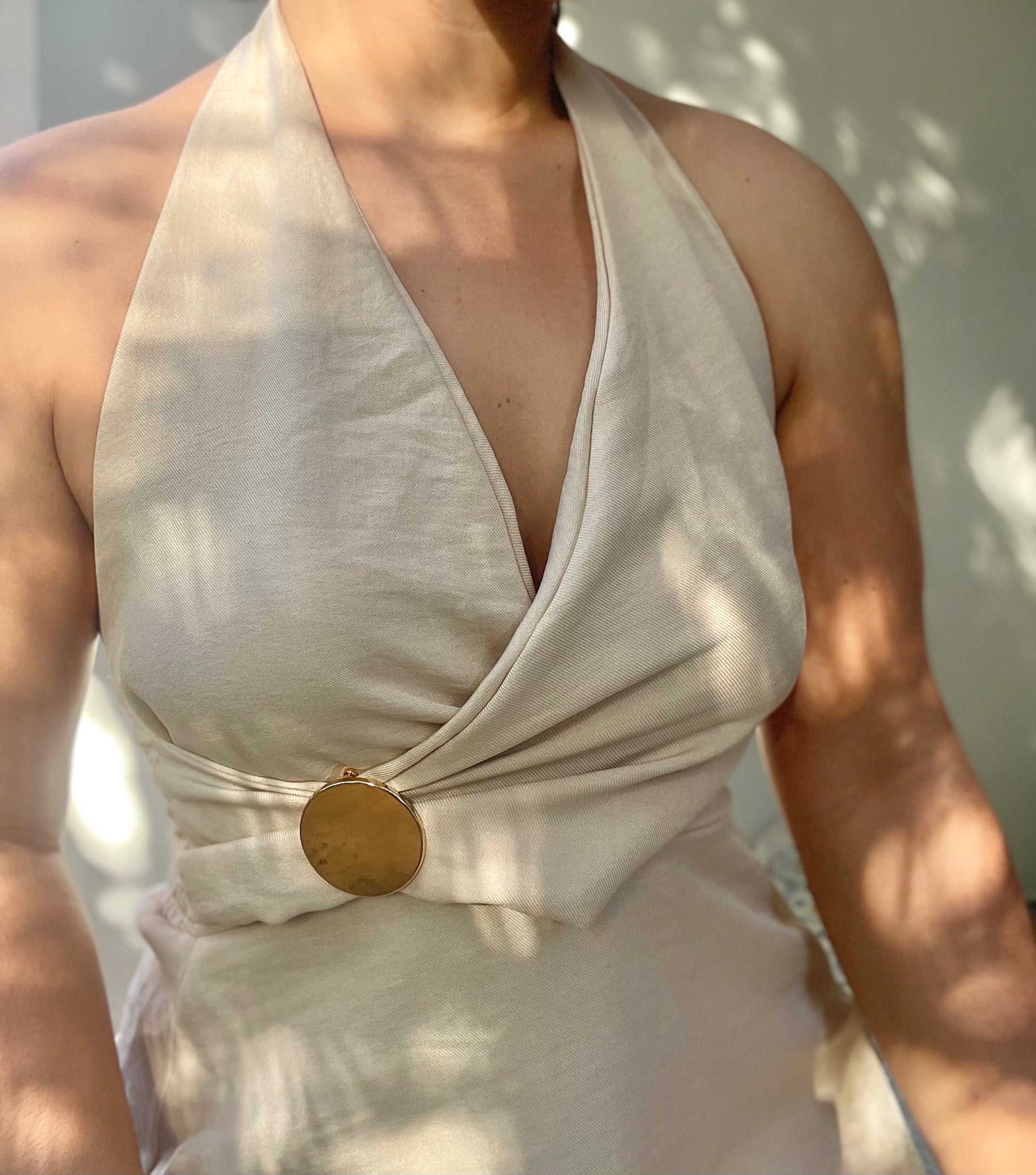 La robe Elena, avec sa coupe cache-cœur flatteuse, est sublimée par une broche dorée ajoutant une touche d’élégance. Cette pièce incontournable mettra en valeur votre silhouette.